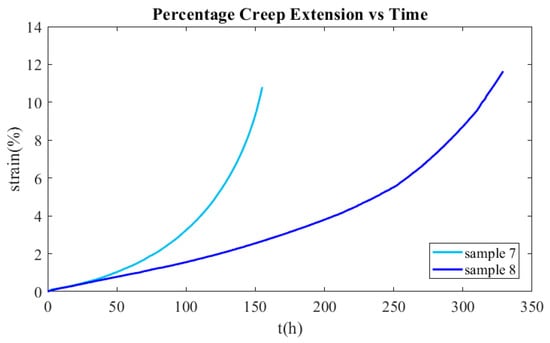To define the creep model governing the AΜ Inconel 625 material, creep tests were conducted on the samples under various temperature and loading conditions. Each creep test was terminated after a rupture occurred, and the duration of each test is mentioned in Table 3, along with the experimental conditions and the resulting strain rate. The strain rate refers to the slope of the secondary stage of the experimental curves. Figure 8 displays the creep curve of sample 5 indicatively. The values of the parameters c1, c2, and c3 of Equation (9) must be determined as a function of temperature using the experimental data presented in Figure 9.