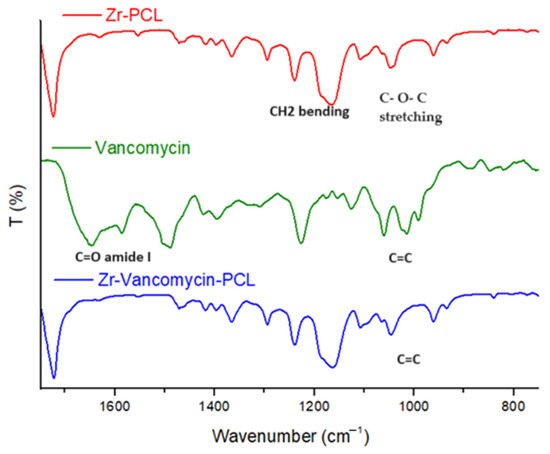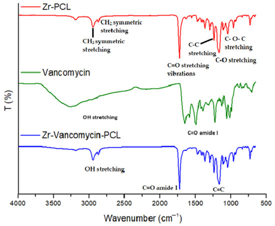 Structural functional groups of PCL, electrospun PCL on Zr surface (Zr-PCL), as well as electrospun PCL with vancomycin coatings on Zr samples (Zr-Vancomycin-PCL) were evidenced via FT-IR analysis [56,57] (Figure 1 and Figure 2, and Table 1).