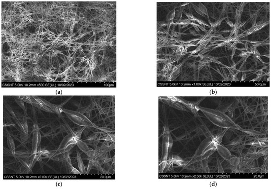 SEM morphologies for Zr-PCL obtained by electrospinning procedure at different magnifications (a) ×500; (b) ×1 k; (c) ×2 k; (d) ×2.5 k.