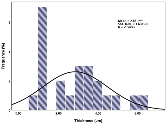 A statistical analysis of the frequency distribution for thickness of PCL wires (SPSS 26 statistical analysis with average value = 2.83 µm, std. dev. = 1.638 µm; N = 23 wires).
