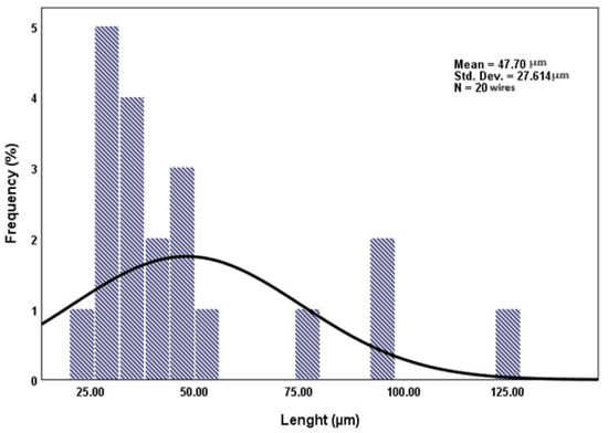 A statistical analysis of the frequency distribution for length of PCL wires (SPSS 26 statistical analysis with average value = 47.70 µm, std. dev. = 27.614 µm; N = 20 wires).