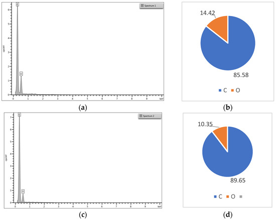 The atomic percent for the elements of the PCL and PCL-vancomycin sample is illustrated in Figure 8b,d. From the energy-dispersive analysis (EDS-Figure 8a–d), the presence of vancomycin is probably highlighted by the increasing C atomic % in the quantitative analysis, with almost 5% compared with the sample without vancomycin (Figure 8d compared with Figure 8b).
