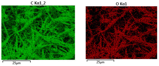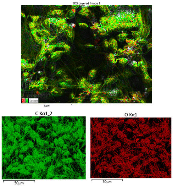 Using EDS, not only were the spectra and the quantitative analysis obtained but also an elemental map for the Zr-PCL and for Zr-vancomycin-PCL samples. This is an important tool to see the distribution of the elements on the entire surface (Figure 9 and Figure 10).