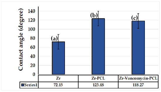 The contact angle was performed for five identical samples to assess the hydrophilic or hydrophobic character of the uncoated Zr and coated samples. According to Figure 11, the contact angle for the Zr sample coated with PCL nanofibers increases significantly (123.48°) compared to the uncoated Zr sample (72.15°). As we can see, the Zr-PCL crosses the hydrophobicity limit due to the porous structure of the nanofibers. By embedding vancomycin into PCL nanowires, the contact angle slowly decreases from 123.48° to 118.27°. The contact angle decrease is associated with vancomycin’s ability to form hydrogen bonds due to the fact that the characteristic peak of the hydroxyl stretching is well visible at 3260–3300 cm−1 being available to form bonds.