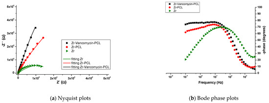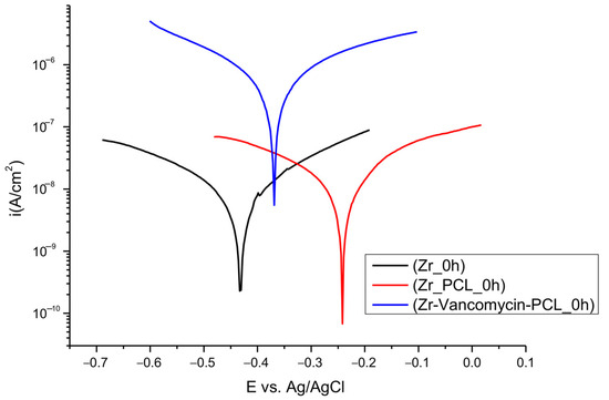The corrosion parameters are illustrated in Table 3 for Zr, Zr-PCL and Zr-vancomycin-PCL, after immersion in SBF, calculated using the Tafel slope extrapolation method.
