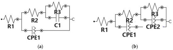 The equivalent circuit for (a) Zr; and for (b) Zr-PCL and Zr-vancomycin-PCL after immersion in SBF.