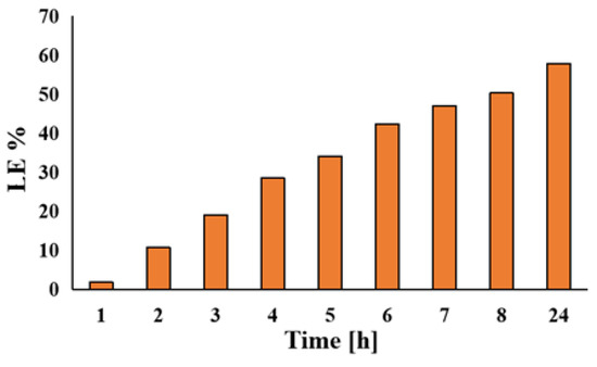 Being one of the first drugs to struggle against MRSA infection, which is well known as a strong threat to public health, vancomycin drug loading and release were studied in various forms. In this study, it was used as a hydrophilic powder, with good solubility. The preparation of the solution consisted of immersing the Zr-PCL nanofiber samples in 10 mL SBF solution containing 2 g/L vancomycin and keeping it for 24 h, followed by calculation of the loading efficiency (Equation (1)).