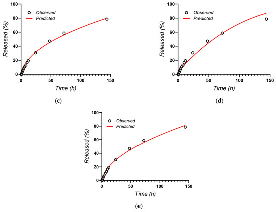 Kinetic models of vancomycin release: (a) Zero Order; (b) First Order; (c) Higuchi; (d) Hixson–Crowell; (e) Korsmeyer–Peppas.