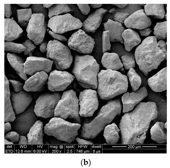 The results of the laser particle size analyzer showed that the particle size of the aeolian sand was between 55 and 187 μm, which was mainly distributed between 94.6 and 121 μm, and the percentage of this part of the particle size was 53.7%. Figure 2 shows the morphology of windlogged sand particles under a scanning electron microscope (SEM), and the granular shape is uniform.