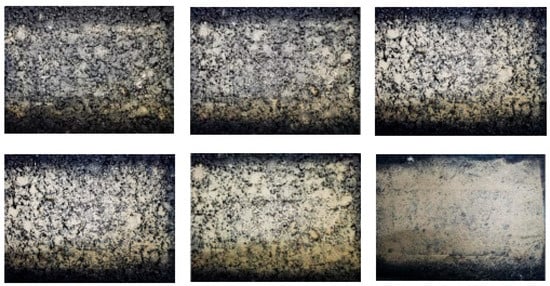 It is analyzed that, due to the aeolian sand particles’ dense, small particle size, it is easy for them to enter the asphalt mixture specimen in the gap, thus filling part of the gap, making the MTD value lower, leading to anti-skid performance, and then with the increase in the density of sand accumulation, asphalt mixture gaps are gradually filled; at this time, the MTD value of the rapid decline in the BPN value also sees a rapid decline. When part of the asphalt mixture surface was covered in wind-accumulated sand, as shown in Figure 3, the wheel–sand–pavement trio form a micro-bearing system, changing the sliding friction for rolling friction, and reducing the anti-skid performance dramatically; when the sand density is 0.3125 kg/m2 (AC-13, AC-16) and 0.750 kg/m2 (SMA-13, SMA-16) for the critical point, at this time, the BPN value tends to stabilize, and the friction is controlled by the sand accumulation, which is caused by the shortcomings of the pendulum friction coefficient meter, and with the increase in sand density, as shown in Figure 3, the wind sand produces resistance to the rubber slider, which makes the BPN value rebound, and this phenomenon is caused by the shortcomings of the experimental apparatus. However, in practice, the aeolian sand coverage is large enough to produce congestion on the wheels, resulting in an increase in vehicle resistance.
