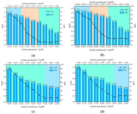 BPN and MTD at different sand accumulation densities. (a) AC-13, (b) AC-16, (c) SMA-13, (d) SMA-16.