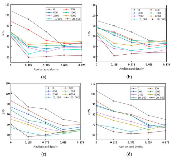 Shown in Figure 6 are the four grades of asphalt mixtures in the sand state under different abrasion times under the BPN value of the change rule. In the same number of abrasions, with the increase in sand density, the BPN value first decreases and then tends to stabilize; if the number of abrasions is small, the BPN value has a significant downward trend, and when the number of abrasions increased to a certain value, the sub-precipitation of the presence of sand under the conditions of the BPN value fell to the minimum, and then tends to stabilize the state. This phenomenon exists in both the AC-graded and SMA-graded asphalt mixtures. For AC-13, in the first 300 times of abrasion, the density of sand accumulation can affect the skid resistance performance, and after 300 times of abrasion, the BPN value almost does not change with the increase in the density of sand accumulation, as shown in Figure 6a. It is analyzed that this is due to the number of abrasions after 300 times, wherein the AC-13 specimen surface texture is almost destroyed, the depth of the structure is reduced, the surface does not accommodate the gap in sand accumulation, and at this time, the wind sand can only be piled up on the surface of the specimen; when the density increases a little bit, the BPN value tends to be stabilized, and even if the density of sand accumulation increases, the BPN value does not change significantly when the density of sand accumulation is increased to 0.625–0.875 kg/m2, the BPN value is not changed significantly when the density of sand accumulation increases to 0.625–0.875 kg/m2, and there appears to be a small increase in the BPN value during the phenomenon. Since the void ratio and structural depth of AC-16 are slightly larger than that of AC-13, the BPN value is almost unaffected by the sand density after the number of abrasion reaches 1200 times.