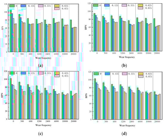 BPN decay with different number of abrasions. (a) AC-13, (b) AC-16, (c) SMA-13, (d) SMA-16.