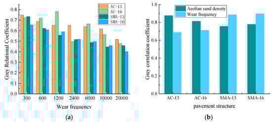 In order to determine the degree of influence of the number of abrasions and the density of sand accumulation on the anti-skid performance of asphalt pavement, the test results were subjected to gray correlation analysis, and the results are shown in Figure 7. Figure 7a shows the sensitivity analysis of asphalt pavement skid resistance performance according to different abrasion times; for AC-13, SMA-13, and SMA-16, the gray correlation coefficient is the largest when the number of abrasion times is 300 times, which means that the abrasion in the early stage of the asphalt pavement skid resistance performance is the largest; in reality, this is usually in the early stage of the road being open to traffic and the skid resistance performance decreases faster; this phenomenon is consistent with the test results. However, the gray correlation coefficient of AC-16 is the largest when the number of abrasions is 1200 times, which means that the impact on the anti-skid performance of the pavement is the largest when the number of abrasions is increased to 1200 times. Figure 7b shows the factor sensitivity analysis of the number of abrasion and sand density on the anti-skid performance of asphalt pavement; for AC-13 and AC-16, the gray correlation coefficient of sand density is larger than that of the number of abrasions, which implies that the sand density has a greater influence on AC-13 and AC-16 than the number of abrasions. However, for SMA-13 and SMA-16, the gray correlation coefficient of the number of abrasions is greater than the sand density. It was analyzed that because the macro structure and internal void of the SMA-graded asphalt mixture are larger than that of the AC-graded asphalt mixture, and this void can accommodate part of the sand, when the internal void is not completely filled, the density of sand will not have a significant effect on the anti-slip performance, while the number of abrasion directly destroys the macroscopic and microscopic structure of the pavement, so the number of abrasions has more influence on the anti-slip performance than the density of sand for the SMA-graded asphalt mixture. Therefore, for SMA-graded asphalt mixtures, the number of abrasions has a greater effect on skid resistance than the sand density. For AC-graded asphalt mixtures, the sand density has a more direct effect on the skid resistance due to the smaller depth of the structure and the internal voids.
