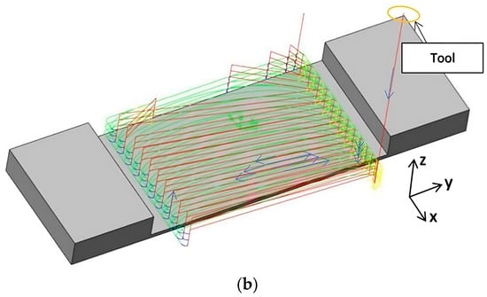 Tool paths during (a) adaptive face milling (increased radial depth) and (b) adaptive cylindrical milling (increased depth of cut)—the green color indicates the tool path during contact with the material, while the red color indicates the tool path during the return to the initial position.