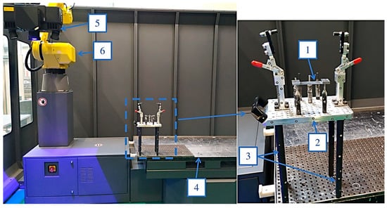The scheme of measuring deviation using the 3D optical scanner: 1—thin-wall sample; 2—universal base; 3—machine posts; 4—rotary table; 5—GOM projector; 6—measuring arm.