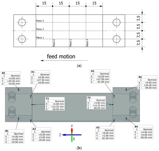 The driving factors behind the use of thin-walled components in many industries are the desire to reduce the weight of structures and lower costs. The realization of these trends is implemented, e.g., by reducing machining time, which forces the use of increasingly newer machining methods or higher values of machining parameters. Available tools, geometrically designed for different strategies, allow working with similar and increased values of cutting parameters [1,2]. Consequently, cutting conditions that allow machining with increased cutting speeds or feed rates are being sought. Despite the advanced level of machining, including thin-walled structures, there are still many limitations that are being analyzed by researchers. One of the main problems of machining thin-walled products is the elastic deformation of the wall during machining, which leads to deformation, resulting in geometric errors and vibrations and deterioration of the quality of the workpiece [3,4,5,6,7,8]. This is due to the low stiffness of the workpiece through the small cross-sectional area of the thin wall. Shape deformation is a serious problem as aerostructure manufacturers strive to improve the quality of their products to remain competitive. This involves the use of increasingly narrower dimensional tolerances [9,10,11]. Based on this, it is concluded that it is necessary to conduct research in this area to determine the effect of cutting conditions on the dimensional accuracy of finished products. In the aspect of the deformation of thin-walled structures, the key is the study of dimensional accuracy, which is the process of measuring and evaluating the conformity of the actual object and surface shape from the assumed model. The results from such measurements are used to assess the quality of manufactured products, and compliance with the assumed requirements and can be the basis for determining the causes of nonconformity, as well as control of production processes. These tests have become crucial in many manufacturing processes due to the stringent requirements for objects. It is almost impossible to obtain a product with the theoretically assumed dimensions, so differences appear between the assumed and obtained shape and dimensions of the finished product [12]. These differences are referred to in terms of deviations, which are positive sign (material allowance) or negative sign (material loss) values of manufacturing error. Geometric accuracy is characterized by errors in dimension, position, and shape, which are factors that affect the functioning of machine components. Occurring errors in the manufacturing process affect the formation of uneven clearances and indentations in joints and uneven stress distribution and ultimately reduce the service life of machine components [13].