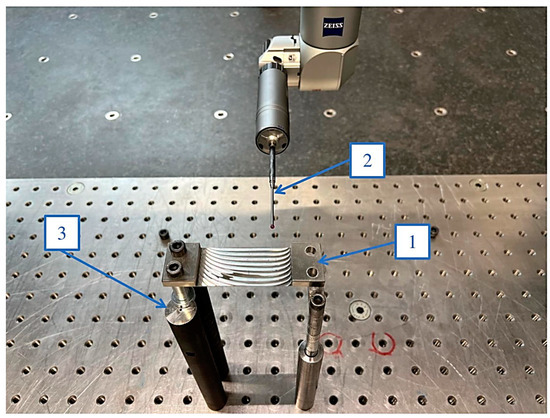 Measuring station for testing deviations by contact method using Zeiss Contura coordinate measuring machine: 1—sample; 2—measuring probe; 3—machine posts.
