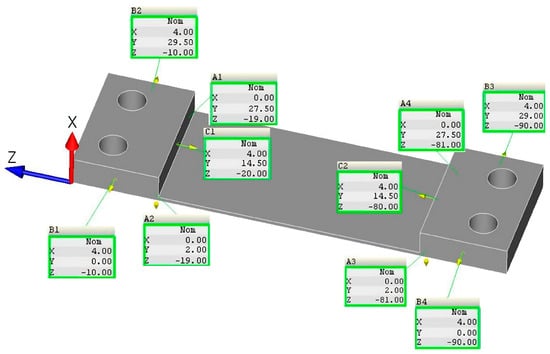 The same measurement conditions were assumed during measuring with a 3D optical scanner; i.e., the same basing method was adopted (Figure 8) and the same measurement points were selected. The description of the measurement planes and their locations were adopted according to the data shown in Figure 6.