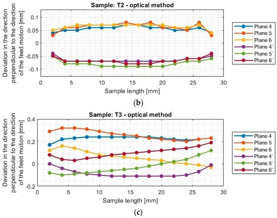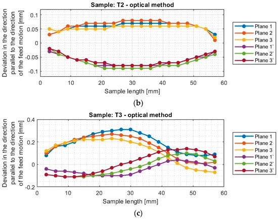 Deviations of the horizontal thin wall in the direction parallel to the direction of tool feed motion for titanium alloy samples machined using adaptive face milling strategy, determined by the optical method: (a) T1; (b) T2; (c) T3 (deviation graph for plane 2 taken from study [44]).