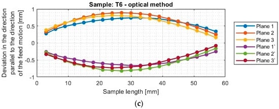 Deviations of the horizontal thin wall in the direction parallel to the direction of tool feed motion for titanium alloy samples machined using adaptive cylindrical milling strategy, determined by the optical method: (a) T4; (b) T5; (c) T6 (deviation graph for plane 2 taken from the study [44]).