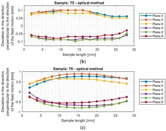 Deviations of the horizontal thin wall in the direction perpendicular to the direction of tool feed motion for titanium alloy samples machined using adaptive cylindrical milling strategy, determined by the optical method: (a) T4; (b) T5; (c) T6 (deviation graph for plane 5 taken from the study [44]).