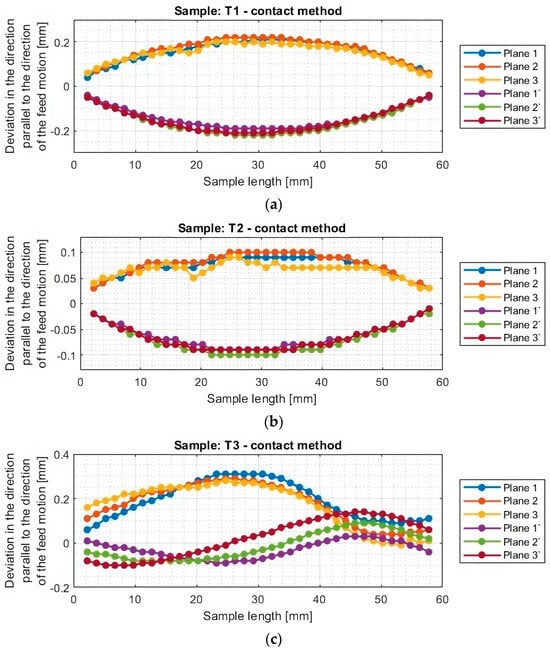 In the second part, the measurement of dimensional and shape accuracy was carried out using a coordinate measuring machine following the conditions described in Section 2.4. The measurement results for individual samples, obtained using the contact method, were obtained in a manner analogous to the results obtained using the optical method. Diagrams of deviations in the direction parallel to the direction of the tool feed motion for titanium alloy samples determined by the contact method are shown in Figure 14 and Figure 15, while diagrams of deviations in the perpendicular direction are shown in Figure 16 and Figure 17.