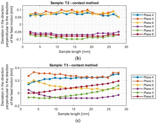 Although the deviations for sample T3 do not reach the largest values, they are very unstable. The surface of this sample is severely deformed after machining, which also presents a very irregular graph shape that indicates that its thin-walled surface is twisted. Smooth graphs (without significant anomalies) and relatively stable values of surface deviations were observed for samples made with the tool for general purposes (T1 and T4) and the tool for high-performance machining (T2 and T5). The presented graphs for these samples, depending on their length, assume a near-horizontal shape, and their values in the range of the sample are comparable, without much mutual scatter between the planes.