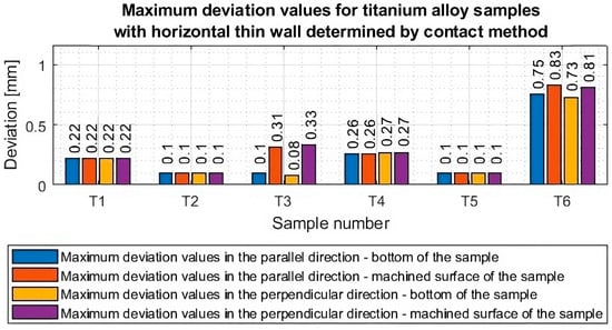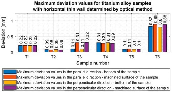 In the next section, the deviations of titanium alloy samples with horizontal thin walls in the direction perpendicular to the direction of the tool feed motion were determined. A graphical representation of these results for each sample is shown in Figure 12.