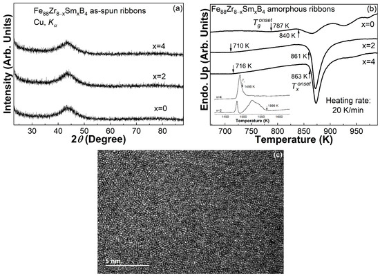 The XRD patterns of the Fe88Zr8−xSmxB4 (x = 0, 2, 4) as-quenched ribbons are illustrated in Figure 1a. The smooth amorphous diffraction peak near 43 degrees and the invisible crystalline peaks suggested that these ribbons were amorphous. The sharp exothermic crystallization peak followed by the smooth endothermic glass transition hump in these DSC traces of ribbons, as shown in Figure 1b, also ascertained their amorphous characteristics.