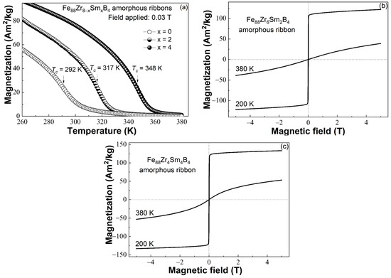 The magnetization vs. temperature (M-T) curves of the Fe88Zr8−xSmxB4 (x = 0, 2, 4) amorphous ribbons were measured from 200 K to 380 K under 0.03 T after a zero-field-cooling (ZFC) process from 300 K to 200 K, as shown in Figure 2a. Therefore, by taking one derivative of the M-T curves, the Curie temperature of the Fe88Zr8−xSmxB4 AA samples was determined to be 292 K for x = 0, 317 K for x = 2, and 348 K for x = 4. The Sm addition dramatically improved the Tc of the Fe88Zr8B4 AAs.