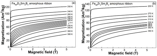 The isothermal magnetization curves of the (a) Fe88Zr6Sm2B4 and (b) Fe88Zr4Sm4B4 amorphous ribbons at various temperatures ranging from 200 K to 380 K under 5 T.