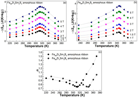 The magnetocaloric behaviors described by the n-T curves of the Fe88Zr8−xSmxB4 amorphous samples are depicted in Figure 4c, where n is the slope of the linear fit for the ln(−ΔSm) vs. ln (H) plots. The shape of the n-T curves of the Fe88Zr8−xSmxB4 metallic glass ribbons was similar to those of other amorphous alloys [32,43]. The minimum n value was ~0.74 at 312.5 K for the Fe88Zr6Sm2B4 ribbon and ~0.745 at 345 K for the Fe88Zr4Sm4B4 sample, both of which were close to the predicted value of fully amorphous alloys [43].