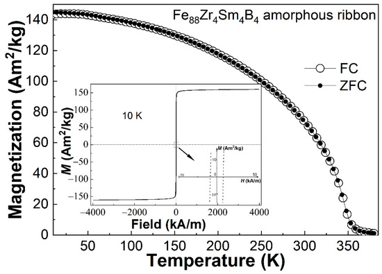 Figure 5 shows the ZFC and field-cooling (FC, field applied: 0.03 T) M-T curves of the Fe88Zr4Sm4B4 AA sample. The ZFC M-T curve of the Fe88Zr4Sm4B4 AA ribbon almost overlapped the FC M-T curve, which implies that there was almost no spin-glass-like behavior in the Fe88Zr4Sm4B4 metallic glass. The hysteresis loop of the ribbon measured at 10 K is shown in the inset of Figure 5. Although the coercivity of the amorphous ribbon slightly increased compared to that of the Fe88Zr8B4 alloy (~4.89 kA/m [32]), its value was only 8.61 kA/m at 10 K; in other words, it was negligible even at 10 K. The invisible spin-glass-like behavior and negligible coercivity at low temperatures indicate that the low-concentration Sm substitution for Zr did not induce an obvious interaction between random anisotropic clusters, and thus, barely affected the magnetocaloric performance of the AA.