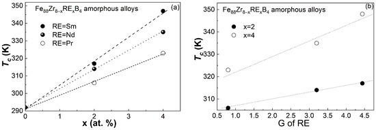 where kB is the Boltzman constant and I(0) is the indirect exchange integral. From Figure 6a, one can find that Tc increases linearly with the RE concentration when the kind of RE is fixed, which is related to the linear increase in the indirect exchange integral with the addition of RE. On the other hand, as the G value is 4.44 for Sm, 3.20 for Nd, and 0.80 for Pr, the Tc of the Fe88Zr8−xSmxB4 AAs is expected to be higher than the Tc of the Fe88Zr8−xNdxB4 AAs and much higher than the Tc of the Fe88Zr8−xPrxB4 AAs according to the equation when the RE concentration is fixed. Figure 6b shows the approximately linear dependence of Tc on the G values of Sm, Nd, and Pr when x = 2 and x = 4 of the Fe88Zr8−xRExB4, both of which demonstrated that the Tc of the Fe88Zr8−xRExB4 AAs is determined by the concentration and G value of the RE. The relationship between Tc and the de Gennes factor also implies the effectiveness of the de Gennes factor in determining or adjusting the Tc of RE-containing AAs.