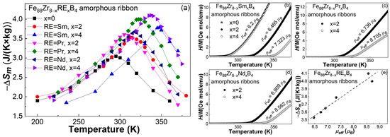 (a) The −ΔSm-T curves under 5 T of the Fe88Zr8−xRExB4 (RE = Sm, Nd, Pr; x = 0, 2, 4) amorphous ribbons; the effective magnetic moment of the (b) Fe88Zr8−xSmxB4 (x = 0, 2, 4), (c) Fe88Zr8−xPrxB4 (x = 2, 4), and (d) Fe88Zr8−xNdxB4 (x = 2, 4) amorphous alloys; and (e) the relationship between the −ΔSmpeak and µeff of the Fe88Zr8−xRExB4 (RE = Sm, Nd, Pr; x = 2, 4) amorphous alloys.