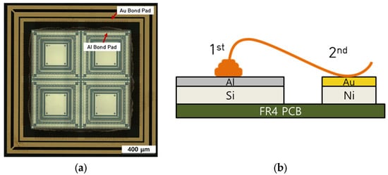 Wire Bonding is a method that bonds a thin metal wire to the pad to create an electrical connection. Compared to the bump used in flip chip bonding, the wire is much longer and has a small diameter, which increases the time to transmit electrical signals and requires space for wire formation; however, it has flexible characteristics, and it is easy to adjust the bonding position [6]. In addition, as the oldest electrical connection method [7,8], the technology is mature and has the advantages of good compatibility with other processes and low cost; therefore, it is used in parallel with other processes [8,9]. The types of wires used for wire bonding are mainly Au, Ag, and Cu. The wire used for wire bonding has a fine thickness and directly affects the efficiency and reliability of the semiconductor module. Therefore, it is important to use a wire with excellent corrosion resistance and joint degradation characteristics.
