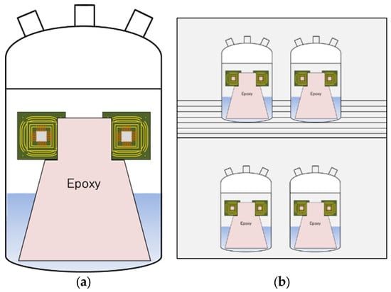 A temperature humidity test was performed for 100 h using the controlled chamber (PR-2J, ESPEC, Osaka, Japan). The unit specimen was fixed on the epoxy mold and the mold was placed in the test solution of the glass cell a shown in Figure 2a, and 4 cells were installed in THT chamber like in Figure 2b. Test solutions were 1% NaCl and 1% NaCl + 0.1% HCl at 85 °C and 85% R.H.