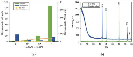 (a) Effect of HCl concentration on the corrosion rate of solid Al, sputtered Al, and bonding wires as a single specimen in deaerated 1% NaCl + x% HCl solution at 25 °C and (b) XRD patterns of solid Al and sputtered Al specimens.