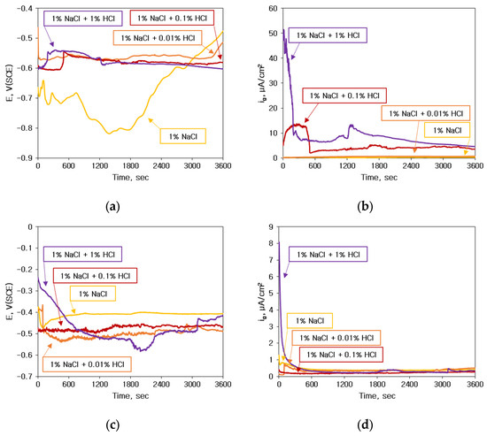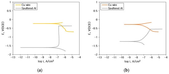 When various types of bonding wires are electrically connected by bonding with Al bond pads, and a corrosive environment containing Cl− ions is formed around them, the potential difference between the wire and Al induces galvanic corrosion. Therefore, to investigate the tendency of galvanic corrosion according to HCl concentration, Au and Cu wires were connected as a galvanic couple with sputtered Al, and an electrochemical galvanic corrosion test was performed. Then the relatively active Al was connected to the working electrode, and the bonding wire was connected to the counter electrode to observe the galvanic corrosion current density and galvanic corrosion potential. Figure 5 shows the effect of HCl concentration on the electrochemical galvanic corrosion between bonding wires and sputtered Al bond pad. Figure 5a,b show the galvanic corrosion potential and galvanic current density between Au wire and Al. The galvanic current density tended to increase with the increase in HCl concentration. The effect of HCl concentration on the electrochemical galvanic corrosion potential and Galvanic current density between Cu wire and sputtered Al is shown in Figure 5c,d. The change in HCl concentration showed no distinct effect on the galvanic corrosion current density between Cu wire and Al.