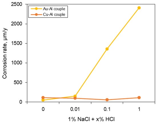 Effect of HCl concentration on the galvanic corrosion rate of sputtered Al specimen coupled with Au or Cu wires in deaerated 1% NaCl + x% HCl at 25 °C.