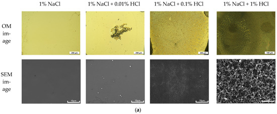 After the polarization test, the changes in the surface morphology of Al specimens were observed by optical microscope (OM) and scanning electron microscope (SEM). Figure 4 shows the surface morphology of solid Al and sputtered Al after polarization tests in deaerated 1% NaCl + x% HCl solution at 25 °C. In the optical image, it can be seen that the overall corrosion of solid Al increased with the increase in the concentration of HCl, and there was a progression of localized corrosion. However, in the case of sputtered Al, the patterns formed did not exhibit significant differences even with the increase in the acid concentration. As shown in the SEM images, in the case of solid Al, localized corrosion was accelerated, while the sputtered Al showed the formation of corrosion products on the surface. The lack of a significant difference in corrosion rate with an increase in HCl concentration is likely attributable to the formation of these corrosion products.