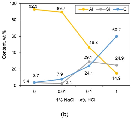 A slightly different trend was observed in the galvanic couple of Cu wire and Al. Figure 8a shows the surface morphology of the sputtered Al specimen after galvanic corrosion test with Cu wire in deaerated 1% NaCl + x% HCl at 25 °C. As the concentration of HCl increased, the corrosion products on the Al surface tended to increase. The oxide formed on the surface was partially cracked at a concentration of 0.1% HCl. At 1% HCl concentration, the cracks became denser and some of the Al oxide films delaminated, exposing the Si. The corrosion products on the Al surface tended to increase with the increase in HCl concentration. The oxides formed on the surface partially showed the shape of cracks at an HCl concentration of 0.1%. At 1% HCl concentration, the cracks became denser and, in some cases, delamination of the Al oxide film occurred, exposing the Si. These results can also be seen in the surface analysis graph. Figure 8b shows the elemental distribution by EDS analysis on the surface after the galvanic corrosion test. The Al content increased with the increase in HCl concentration up to 0.1%, but at 1% HCl concentration, O and Si increased, and Al decreased. This was because of the delamination of Al oxide and exposure of Si. Exposure of Si of the matrix structure accelerates the galvanic corrosion rate with the dissolution of Al.