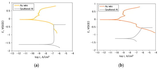 Figure 3a shows the effect of HCl concentration on the corrosion rate of solid Al, sputtered Al, and bonding wires as a single specimen by polarization test in deaerated 1% NaCl + x% HCl solution at 25 °C. Solid Al generally exhibits weak corrosion resistance in environments where Cl− ions are present [39]. In the case of solid Al, the corrosion rate increased significantly with the increase in the concentration of HCl. However, an increase in HCl concentration did not significantly affect the corrosion resistance of sputtered Al used in the bonding pad. The corrosion rates of Au and Cu wires used as bonding wire materials tended to increase with the increase in HCl concentration, but there was a minimal effect on the corrosion rate. Among the four specimens, the Au wire showed the lowest corrosion rate. Solid Al showed a high corrosion rate depending on the HCl concentration, but sputtered Al showed a relatively small value. Table 2 shows the corrosion current density and corrosion potential of the test specimens by polarization curves.