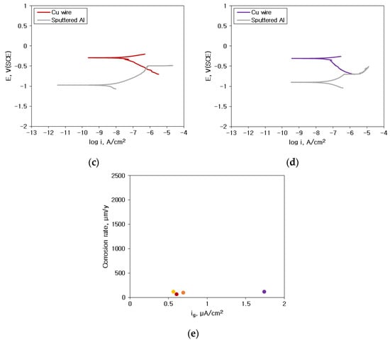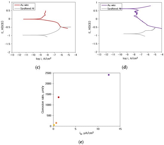 Figure 10e and Figure 11e show the relationship between the corrosion rate obtained by the galvanic test and galvanic current density (ig) estimated by the mixed potential theory (yellow dot: 1% NaCl, orange dot: 1% NaCl + 0.01% HCl, red dot: 1% NaCl + 0.1% HCl and purple dot: 1% NaCl + 1% HCl). In the case of galvanic couple with Au wire and Al, the galvanic corrosion rate increased with the increase in the ig. The ig also showed a linear increase with the increase in HCl concentration. However, in the case of the galvanic couple with Cu wire and Al, the effect of ig on the galvanic corrosion rate was less correlated.