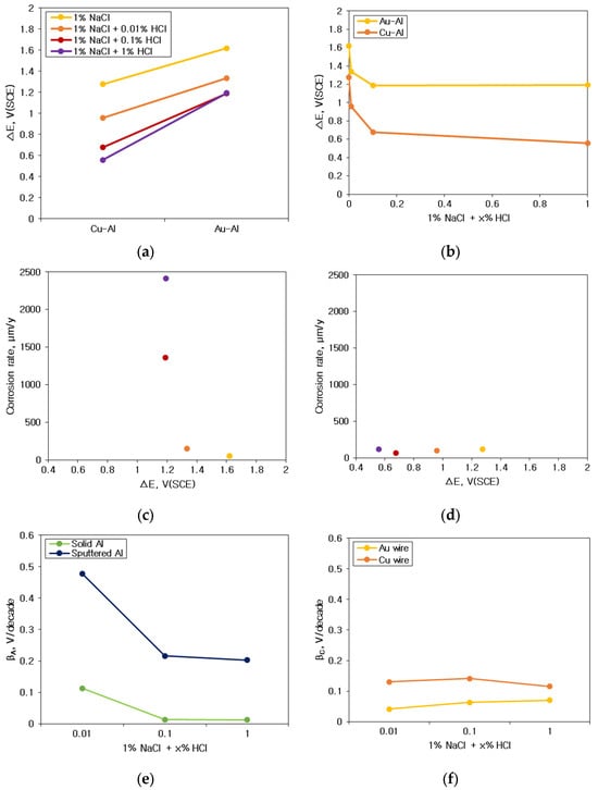 Figure 12 shows the interpretation of galvanic corrosion factors in deaerated 1% NaCl + x% HCl solution at 25 °C. Figure 12a,b show the effect of ΔE on the galvanic corrosion behavior of two metals connected as a galvanic couple. As shown in Figure 12a, when the material connecting Al and the galvanic couple changed in the same environment, the ΔE between Au wire and sputtered Al, which showed a high corrosion rate with an increase in the concentration of HCl, became larger than those of Cu-Al couples. In other words, when the environment is constant, ΔE shows a high correlation with the galvanic corrosion rate. However, as shown in Figure 12b, for the same galvanic couple, when the HCl concentration increased, ΔE decreased despite the increase in galvanic corrosion rate. These findings indicate that for the same galvanic couple, the galvanic corrosion behavior with changing concentrations of HCl cannot be explained by ΔE. Figure 12c,d show the correlation of ΔE by mixed potential theory and galvanic corrosion rate (yellow dot: 1% NaCl, orange dot: 1% NaCl + 0.01% HCl, red dot: 1% NaCl + 0.1% HCl and purple dot: 1% NaCl + 1% HCl). Figure 12c shows the correlation between the ΔE by the mixed potential theory and the corrosion rate of Al with Au wire by HCl concentration. The ΔE decreased with an increase in the concentration of HCl. Figure 12d shows the correlation between the ΔE by the mixed potential theory and the corrosion rate of Al with Cu wire by HCl concentration. The correlation between HCl concentration and the ΔE was low. This indicates that the ΔE by the mixed potential theory has a low correlation with the galvanic corrosion rate. Figure 12e,f show the βA βC by polarization curves and galvanic corrosion behavior by HCl concentration. Figure 12e shows the βA of Al with increasing HCl concentration in the polarization behavior. It shows that the βA of solid Al and sputtered Al tended to decrease with an increase in the HCl concentration. Figure 12f shows a graph of the variation of βC with the concentration of HCl by wire material. It shows that βC increased for Au wires with an increase in the concentration of HCl but slightly decreased for Cu wires in 1% HCl solution. This comparison of βA on Al and βC on wire materials explains the effect of HCl concentration variation on galvanic corrosion behavior in the same galvanic couple, which is shown in Figure 13.