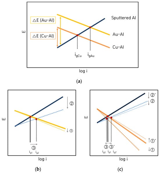 Figure 13 shows the galvanic corrosion models between bonding wires and Al bond pad. Figure 13a illustrates a model showing the dissimilar metal effect, which shows that the potential difference (ΔE) is the determinant of the galvanic corrosion behavior of dissimilar metals in the same environment. Figure 13b shows the HCl concentration effect in the Au wire—Al couple; the galvanic corrosion rate increased with the decrease in the βA of Al (②) and the increase in the βC of the Au wire (①). Figure 13c shows the HCl concentration effect in the Cu wire—Al couple, as the HCl concentration increased; the βA of Al decreased (②, ②’), but the βC of Cu wire increased (①) and then decreased again (①’). These findings indicate a close correlation of the βA and the βC with the galvanic corrosion rate.
