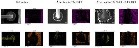 Galvanic corrosion in the first ball bond area: Figure 15 shows the elemental distribution of the Au wire—Al pad first bond area before and after THT at 85 °C and 85% relative humidity for 100 h. The aluminum pad near the Au wire ball bond was oxidized, but the corrosion product was barely detected in the case of 1% NaCl. However, in the case of 1% NaCl + 0.1% HCl, the aluminum pad near the Au wire ball bond was severely corroded. On the other hand, Figure 16 shows the elemental distribution of the Cu wire—Al pad first bond area before and after THT at 85 °C and 85% relative humidity for 100 h. In the case of 1% NaCl and 1% NaCl + 0.1% HCl, the aluminum pad near Au wire ball bond was severely corroded.