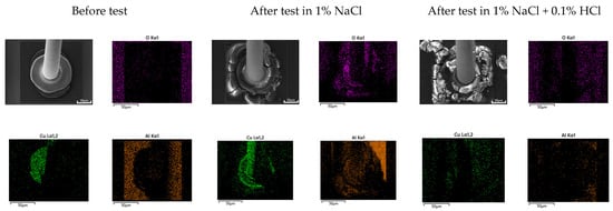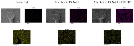 Generally, when dissimilar metals are connected in a corrosive environment, galvanic corrosion occurs wherein the active metal accelerates corrosion, and the noble metal is protected. Al is a relatively active material for galvanically coupled bonding wires. The galvanic current density results showed positive current density values for active Al. Therefore, the bonding wire should be protected by the sacrificial anode effect of Al. Figure 9 shows the surface morphology of (a) Au wire and (b) Cu wire before and after the galvanic corrosion test with sputtered Al pad in deaerated 1% NaCl + x% HCl solution at 25 °C. While Au wire showed some formation of corrosion products on its surface as the concentration of HCl increased, it did not show any significant changes compared to the surface before the test. However, in the case of Cu wire, the surface morphology changed as the concentration of HCl increased, causing the formation of corrosion products and partial dissolution. In particular, with a further increase in the HCl concentration to 1%, the dissolution of Cu wire resulted in a reduction in wire thickness. When forming a galvanic coupled with Al, the Cu wire is protected by the sacrificial anode effect of Al in a mildly corrosive environment. However, in a severely corrosive environment, both Al and Cu wires are corroded and cannot be completely protected by Al. Therefore, the corrosion rate of Al in the galvanic coupled between Cu wire and Al is not obvious when evaluating the effect of HCl concentration.