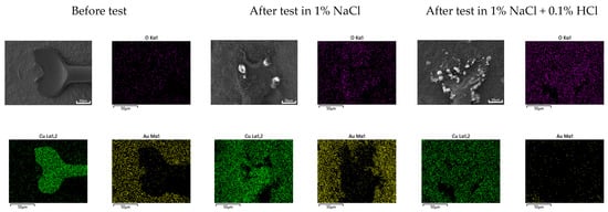 Figure 6 shows the effect of HCl concentration on the galvanic corrosion rate of sputtered Al specimen coupled with Au or Cu wires in deaerated 1% NaCl + x% HCl at 25 °C. The corrosion rate when Au wire and Al were connected in a galvanic coupled was higher than that of the single sputtered Al specimen upon exposure to the corrosive environment. The corrosion rate increased with the increase in the HCl concentration. On the other hand, when Cu wire and Al were connected in a galvanic couple, the corrosion rate of Al did not change significantly despite the increase in HCl concentration. This difference in corrosion behavior was analyzed by observing the surface of Al after the galvanic corrosion test.